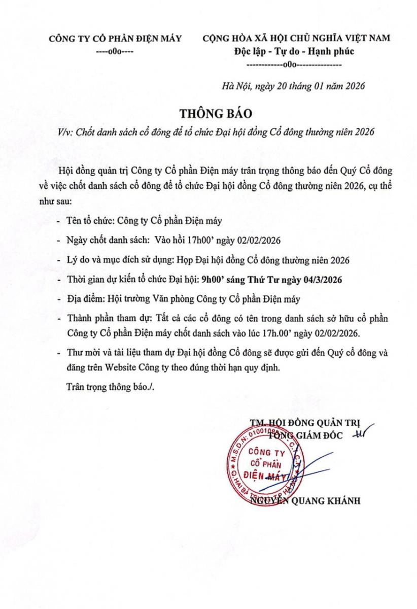 Hội đồng quản trị Công ty Cổ phần Điện máy trân trọng thông báo đến Quý Cổ đông về việc chốt danh sách cổ đông để tổ chức Đại hội đồng Cổ đông thường niên 2026, cụ thể như sau: